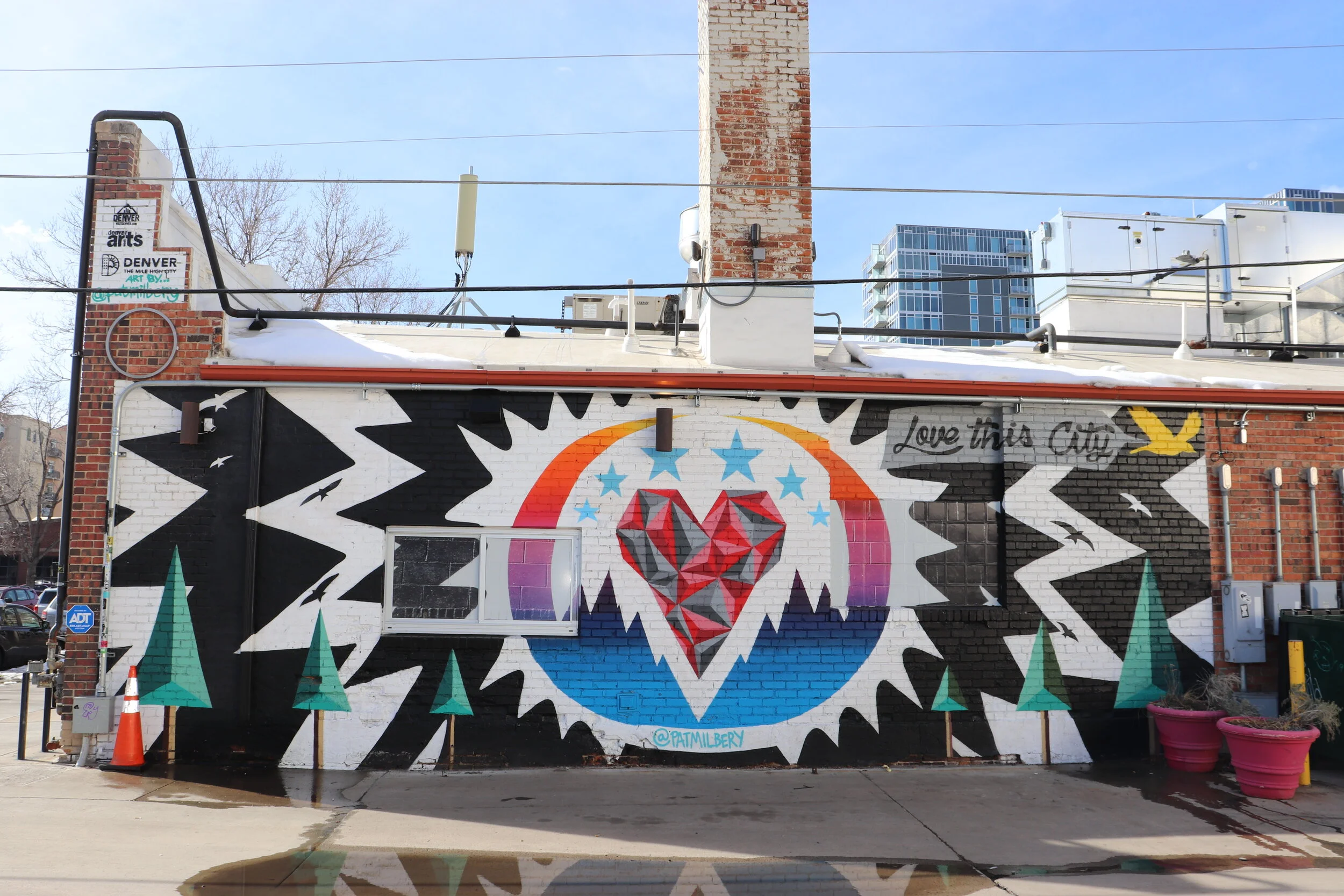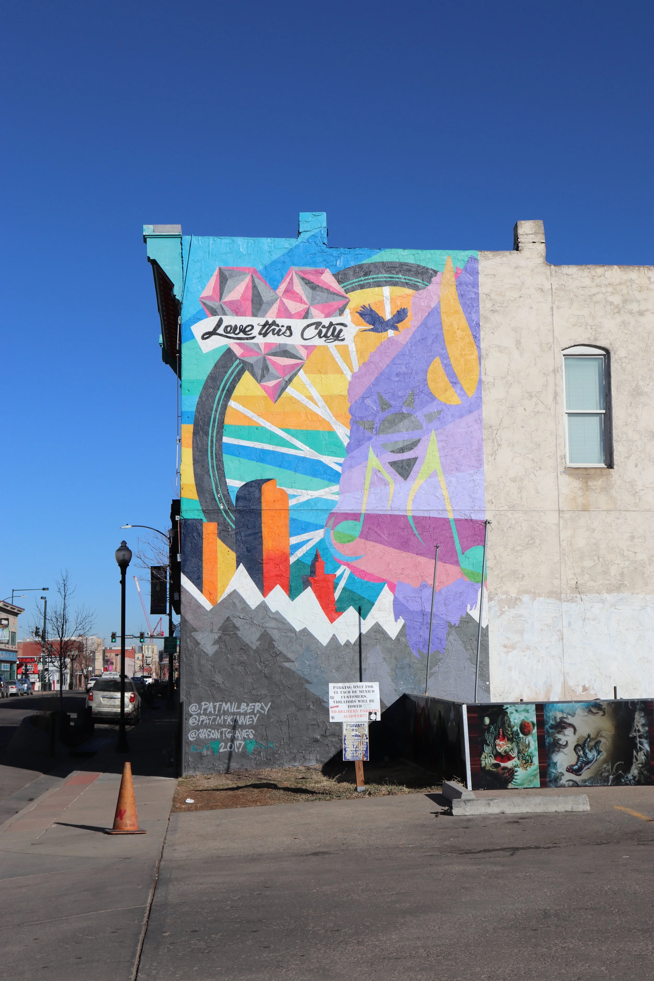 Directly across the street from Su Teatro’s distinctly Chicana/o murals stands Love this City. Pat Milbery takes design credit for the street art mural, which he painted during Denver Arts Week with fellow street artists Pat McKinney and Jason T. Graves. The mural spans the height of the two-story building that houses El Noa Noa Tex-Mex Restaurant. Milbery’s colorful, bright design features elements of Denver culture. Iconic buildings of the Denver skyline, including the state capitol, emerge behind a cluster of pine trees and the foothills and peaks of the Rocky Mountains. Milbery also displays a bicycle tire, referencing the city's bike-friendly nature, and native animals such as a soaring eagle and a buffalo facing the street. Almost unrecognizable at first glance, the buffalo takes an abstracted form, its steadfast nature symbolizing the community’s strength.[41] Finally, a pink and grey geometric heart with a white banner reading “Love this City” sits atop the composition. Milbery states that the many geometric pieces of the heart represent the “many different layers of love,” from joy to pain.[42]