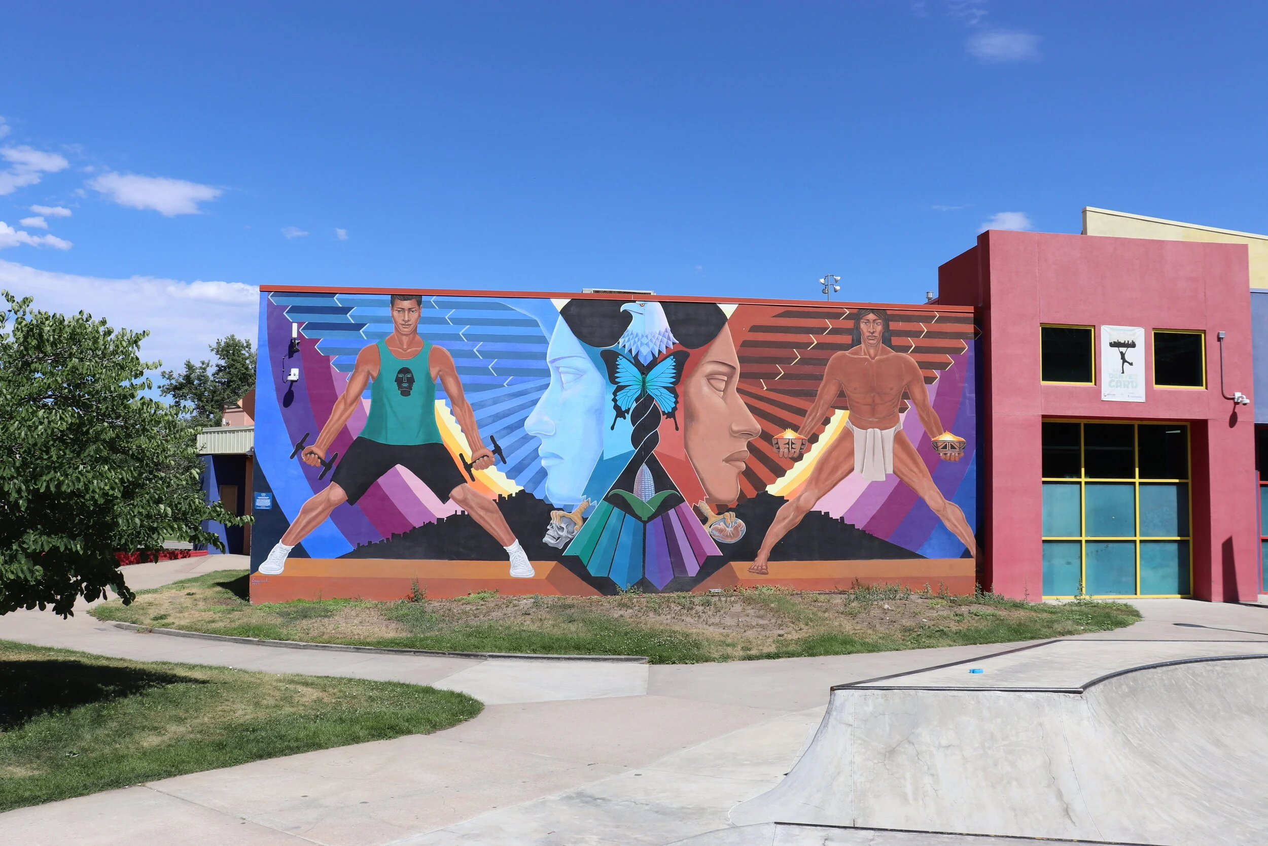 In his essay “Arte Chicano: Images of a Community,” cultural historian Tomás Ybarra-Frausto discusses the various ways Chicanas/os use art to form a communal cultural identity. He finds that Chicana/o artists challenge the status quo and imposed hierarchies of the Anglo-American art world by making art more democratic and participatory through their community practices.[19] For example, muralist, sculptor, and painter Emanuel Martinez initiated the production of collaborative murals in La Alma-Lincoln Park in the 1970s. Together with local youth, the Denver-native began painting various buildings and homes throughout the neighborhood. In 1977 at La Alma Recreation Center, Martinez and various volunteers created La Alma, a mural that stands as the community's physical and spiritual soul (figure 3). It features a contemporary Chicano and his Indigenous ancestor in identical poses, illustrating the community’s foundational connection to Aztlán, the ancestral homeland of Chicanas/os. The towering figures appear as strong warriors who will fight for the survival of their cultures. His work reflects the spirit of his contemporaries, including fellow Denverites Carlota EspinoZa and Tony Ortega, and inspires younger generations of muralists, such as Arlette Lucero and JOLT.